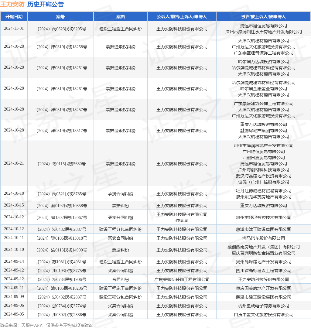 案号:(2024)闽0623民初6295号审理法院:漳浦县人民法院案由:建设工程施工合同纠纷当事人信息: 原告/上诉人:王力安防科技股份有限公司 被告/被上诉人:清远市旭恒贸易有限公司、漳州市漳浦润江水岸房地产开发有限公司开庭日期:2024年11月1日根据统计,近一年内以王力安防科技股份有限公司为当事人的历史开庭公告有105则,其中案由为“买卖合同纠纷”的公告以31则居首,其次为“合同纠纷”有13则,“侵害商标权纠纷”有9则。历史开庭公告(前20条)如下: